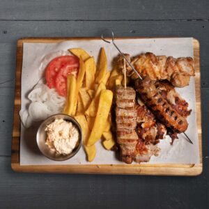 hausgemachtes Hacksteak mit Schafskäse gefüllt, dazu Pommes, Tzatziki & Paprika-Dip A,C,H